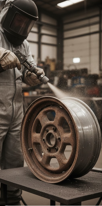 Die Qualität der Oberflächenvorbereitung entscheidet über die Langlebigkeit der Pulverbeschichtung. Sandstrahlen entfernt Rost, alte Lackschichten und Korrosion bis auf das blanke Metall.
